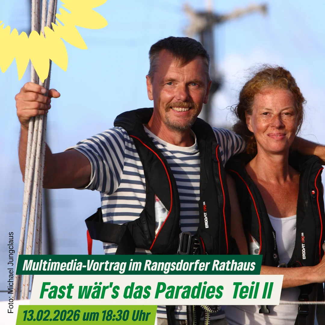 Aus dem Logbuch einer politischen Weltumsegelung von Tahiti bis Australien berichtet Michael Jungclaus am 13.02.2026 um 18.30 Uhr im Rangsdorfer Rathaus. Zum Multimedia-Vortrag lädt die Ortsgruppe von Bündnis 90/Die Grünen in den Sitzungssaal ein. Der ehemalige Landtagsabgeordnete und seine Frau Uta umsegelten von 2019 bis 2024 die Welt mit ihrem Segelboot Daphne. Auf ihrer Route beschäftigten sich die Beiden nicht nur mit den seglerischen und touristischen Aspekten ihres Abenteuers, sondern auch mit politischen und gesellschaftlichen Themen.